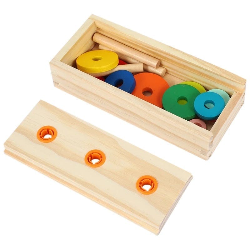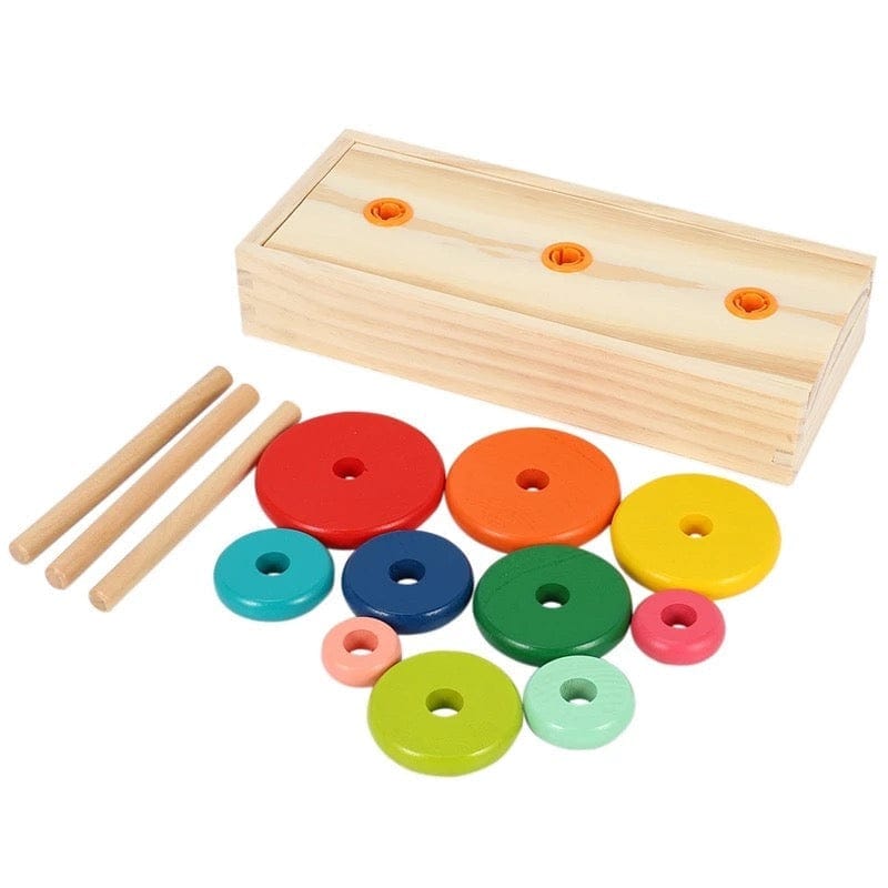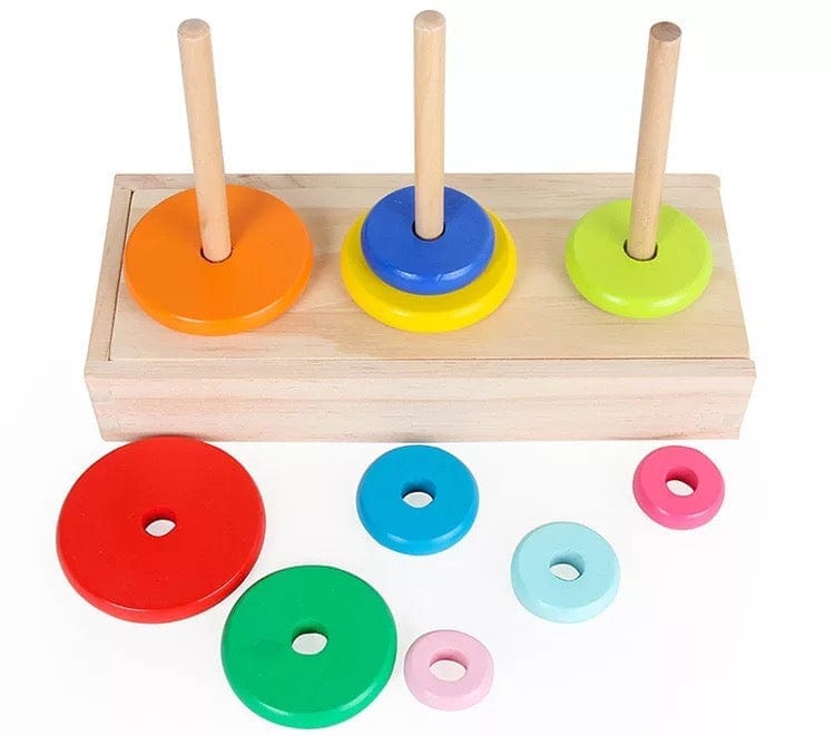 👉 Indicado para crianças a partir de 3 anos para a uma brincadeira simples de encaixe e a partir de 6 anos para a aplicação dos desafios de estratégia propostos pela Torre de Hanói.